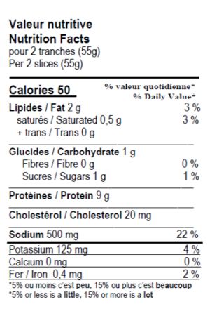 Porc, Eau, Sel, Sucres (extraits secs de glucose), Phosphate de sodium, Substance aromatisante, Érythorbate de sodium, Nitrite de sodium, Fumée. Enveloppé de collagène.